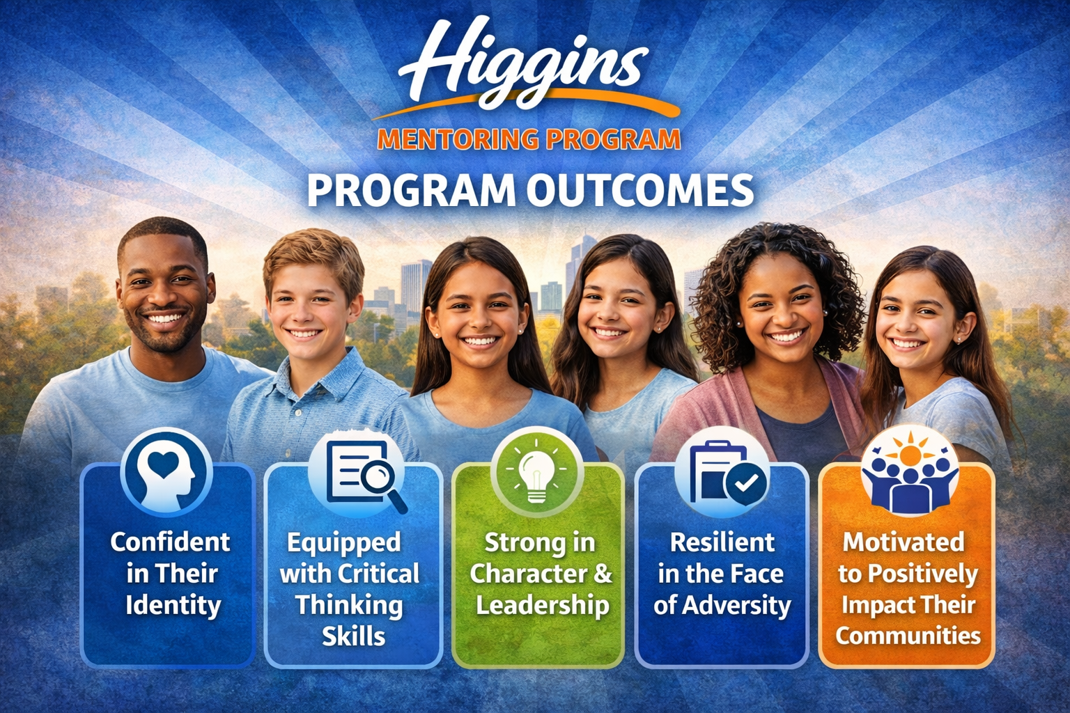 The Higgins Mentoring Program is designed to develop well-rounded youth who are confident, capable, and prepared to contribute positively to their communities. Through structured mentorship and evidence-based development practices, the program aims to produce our five measurable outcomes.