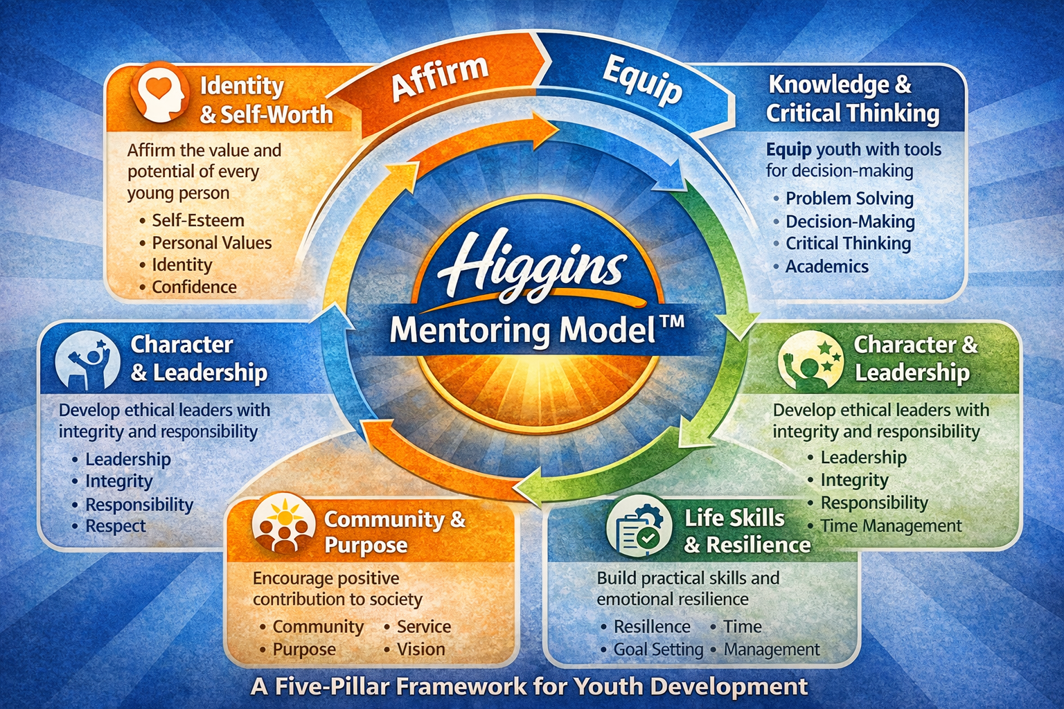The Higgins Mentoring Model™ is a structured mentorship framework designed to empower youth through intentional guidance, evidence-based development practices, and community engagement. The model focuses on strengthening identity, building life skills, and inspiring future leadership through five core pillars.